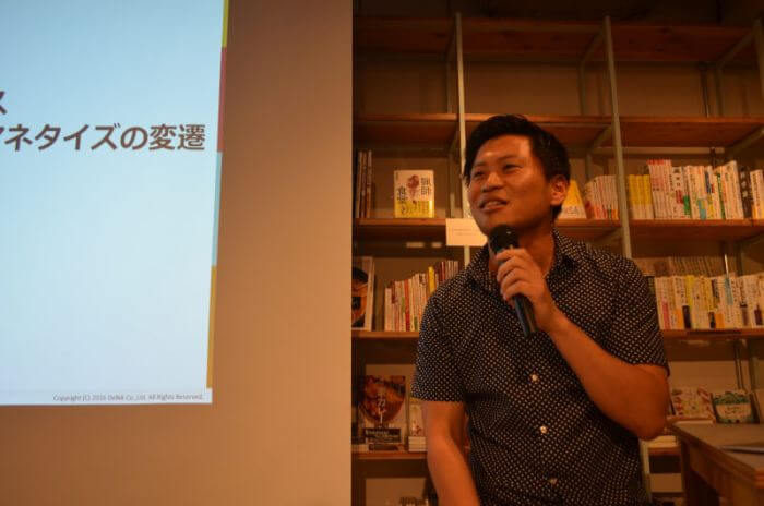 まず登壇したのは、㈱DeNAの安江氏。サービスのフェーズごとによるマネタイズ手法についてプレゼンしてもらいました。