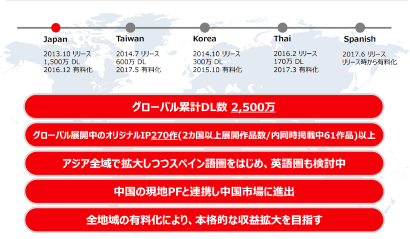 今回は海外展開のこれまでの歩みを紹介させてもらいます。2014年に台湾・韓国、2016年にタイに進出しました。中国では、現地プラットフォームと提携し、形を変えてサービス展開しています。