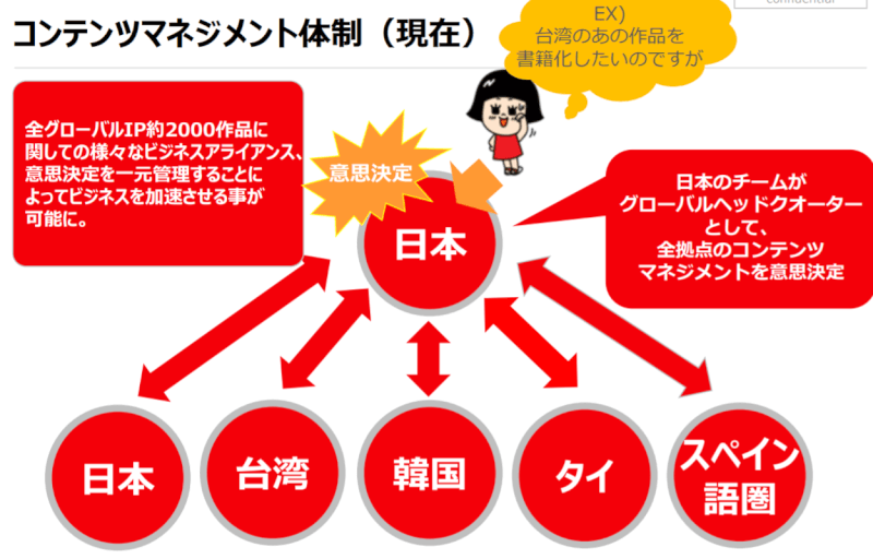 そこでグローバルのマネジメント体制を変え、日本をヘッドクオーターとして、世界全拠点のコンテンツマネジメントを意思決定する方針に変更したのです。全グローバルIPに関しての意思決定を一元管理することで、グローバルビジネスを加速させることでができました。