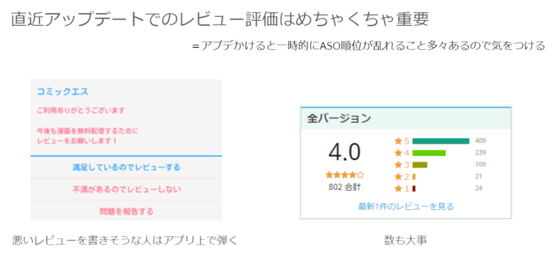 レビューの評価もとても大事で、特に直近アップデートのレビュー評価は超重要です。アプリ内でレビューを求めるサービスも多いですが、コミックエスの場合は「満足しているのでレビューする」以外に、「不満があるのでレビューしない」「問題を報告する」という欄を作ることで、アプリを満足してもらった人にはレビューをしてもらい、不満を持っている人はレビューしない、または問題を報告してもらえるようにしています。近々Appleからレビューを促すポップアップが禁止されるそうですが、レビューの数も大事なので良いレビューをしてもらう施策がより重要になってきます。