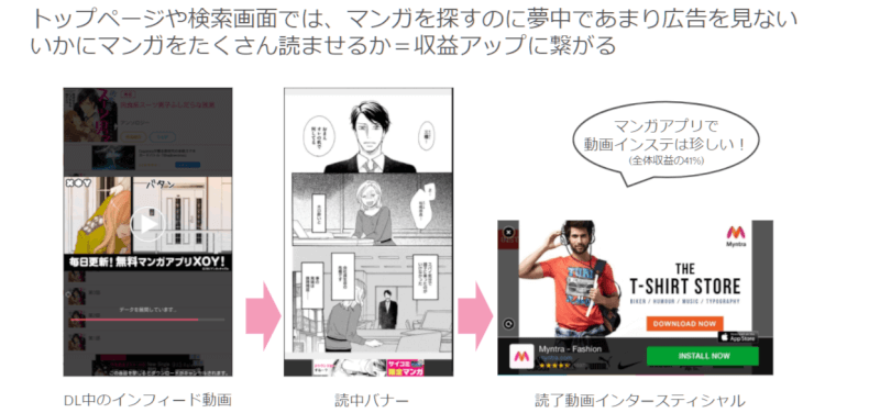 コミックエスでは「DLのインフィールド動画」「読中バナー」「読了動画広告」を利用しています。読了後の動画広告も嫌われると思いがちですが、YouTubeの動画広告も最初は自分自身も良い印象を持っていませんが慣れてしまえば問題なく、今では順調に収益を上げています。