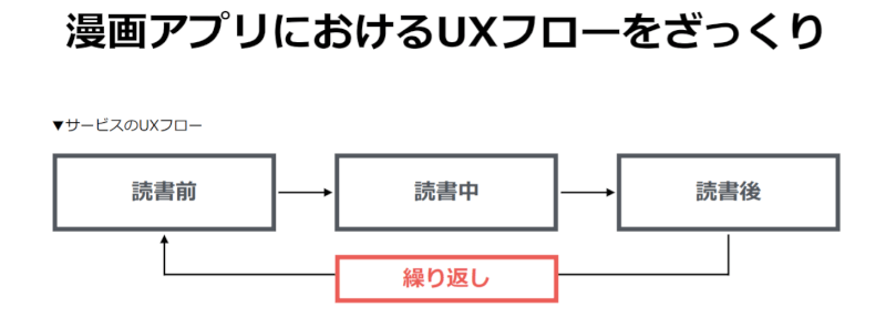 そして継続率を上げる前にUXフローをしっかり整理する必要があります。マンガアプリのUXフローを考える場合には「読書前」「読書中」「読書後」にしっかり分けて考えなければいけません。