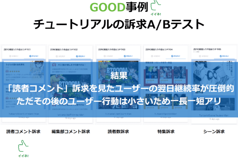 まず紹介するのは、読書前の「チュートリアルの訴求A/Bテスト」です。様々なパターンのチュートリアルをリアルタイムでA/Bテストを行いました。その結果、最も結果が良かったのが読者のコメントが表示される「読者コメント訴求」です。ユーザーの翌日継続率が圧倒的に高いという結果が出ました。だたし、その後のユーザー行動が小さいので一長一短ではありますが。