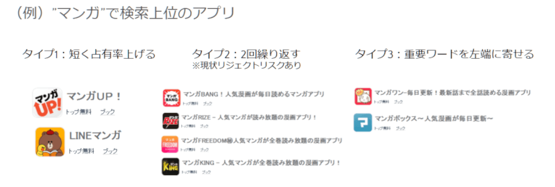 まずはアプリのユーザー獲得術ですが、ASO(アプリストアでの検索上位最適化)の成果を出す上で、経験上大切だと思っているのは「タイトル」「レビュー評価」です。まずタイトルに関してですが、タイトルに狙っているワードを入れないとなかなか上位に表示されません。”マンガ”で検索順位を上げるには、「マンガUP」や「LINEマンガ」のように全体を短くして占有率を上げるのが一つの手です。また、ワードを2回繰り返す方法もありますが、現在ではリジェクトされるリスクもあるので気をつけましょう。