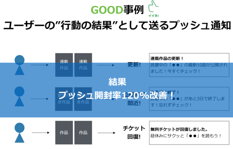 最後に紹介するのが「ユーザーの行動の結果として送るプッシュ通知」です。例えば、連載作品を読んでいるユーザーには「連載作品の更新を知らせる通知」。期限付き作品を読んだユーザーには「あと何日で配信終了か教える通知」と言った風に、ユーザーの行動によってプッシュ通知の内容を変えました。これによりプッシュ開封率が120%改善されました。