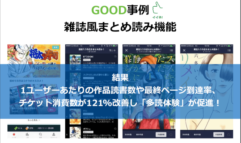 次に紹介するのは「雑誌風まとめ読み機能」です。1話読むと次の作品、1話読むと次の作品という風に紙の雑誌のように漫画が楽しめる機能です。これにより1ユーザーあたりの作品読者数や最終ページ到達率、チケット消費数が121%改善し「多読体験」が促進されました。